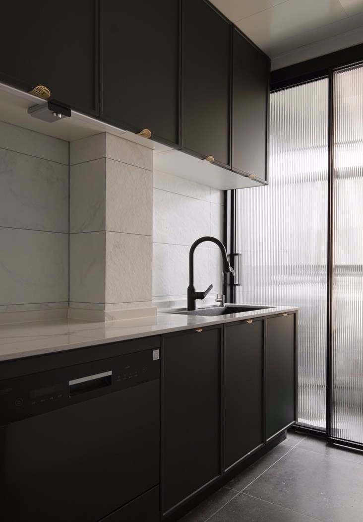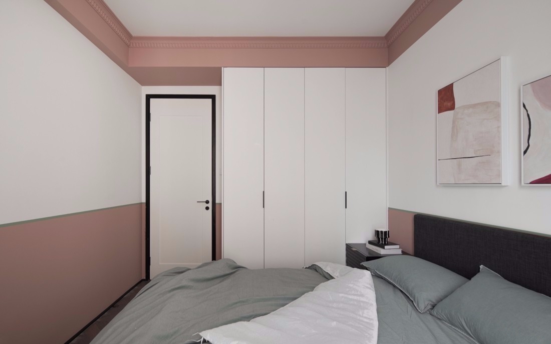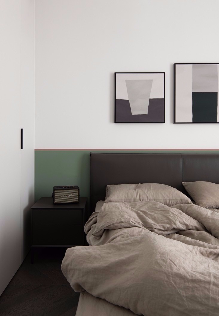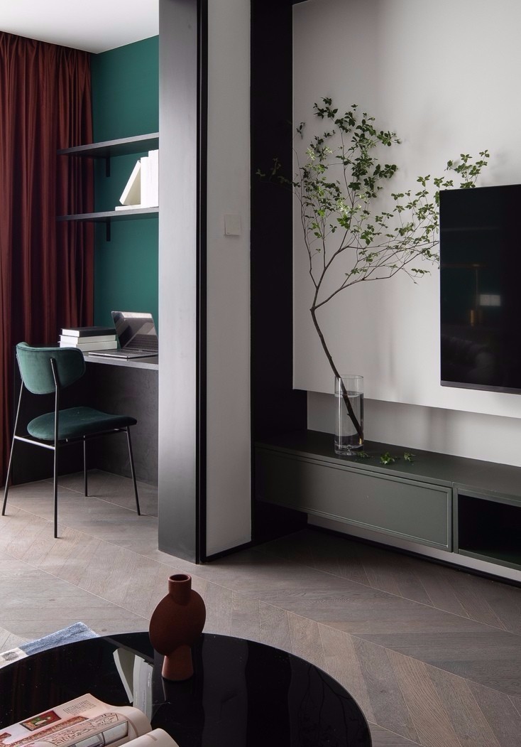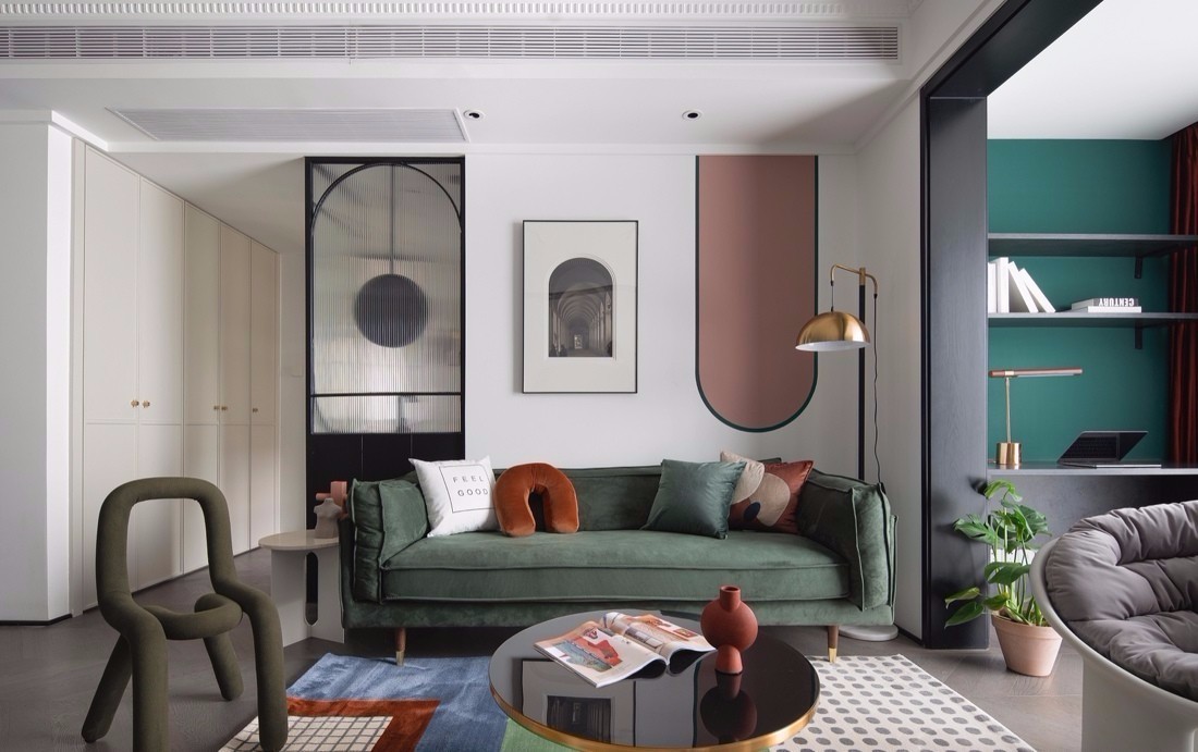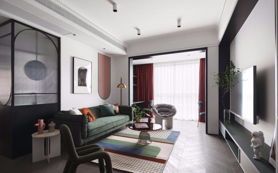 客廳空間以白色為主色調(diào),融入墨綠、酒紅、臟粉等低飽和度彩色,為空間增添了繽紛、動(dòng)感的視覺效果。