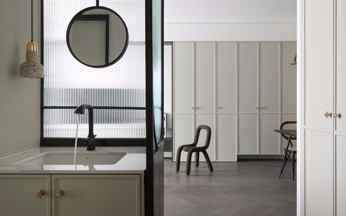 由客廳望向餐廳??筒蛷d公共空間以白色為主色調(diào),點(diǎn)綴貫穿全屋的粉和綠。餐邊柜旁的門神,守護(hù)陪伴著一家三口,也為這個(gè)家注入了更多年輕活潑的元素。